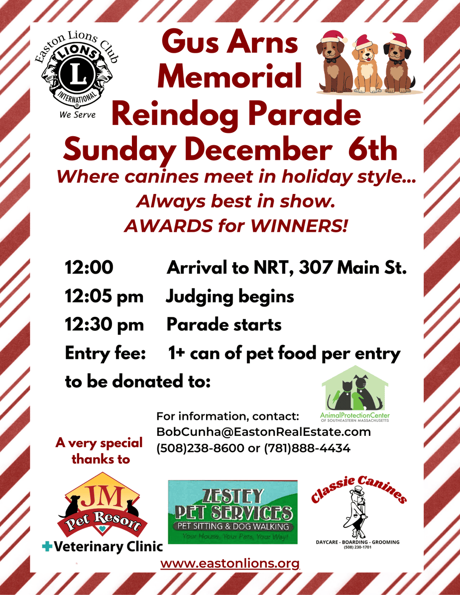 Since 1986, at the Rockery and Oakes Ames Memorial Hall in North Easton, Massachusetts, Easton townfolks celebrate the holiday season with the annual Easton Holiday Festival coordinated by the Easton Lions Club and supported by many local businesses and families in Easton. This event happens the first full weekend in December each year with the Easton Lions cooking up burgers, dogs and fried dough; bouncy houses, train and hay rides, carnival games for the kids. It also highlights local artisans in a special marketplace inside the historic Oakes Ames Memorial Hall, free musical entertainment on the Rockery, the walk of the reindogs in the holiday parade down main street to the festivities area, and visits by Santa throughout the events.